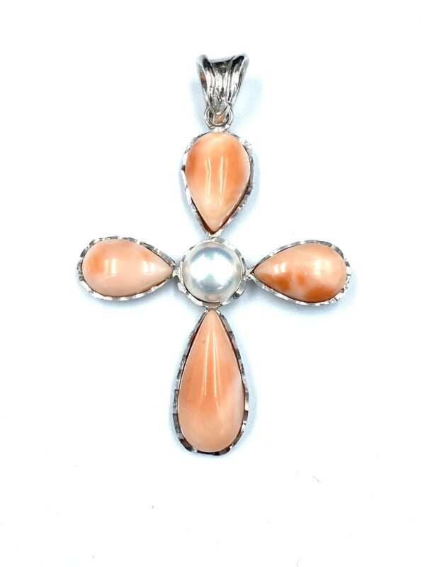 Ciondolo Croce Argento 925% Corallo Rosa Perla