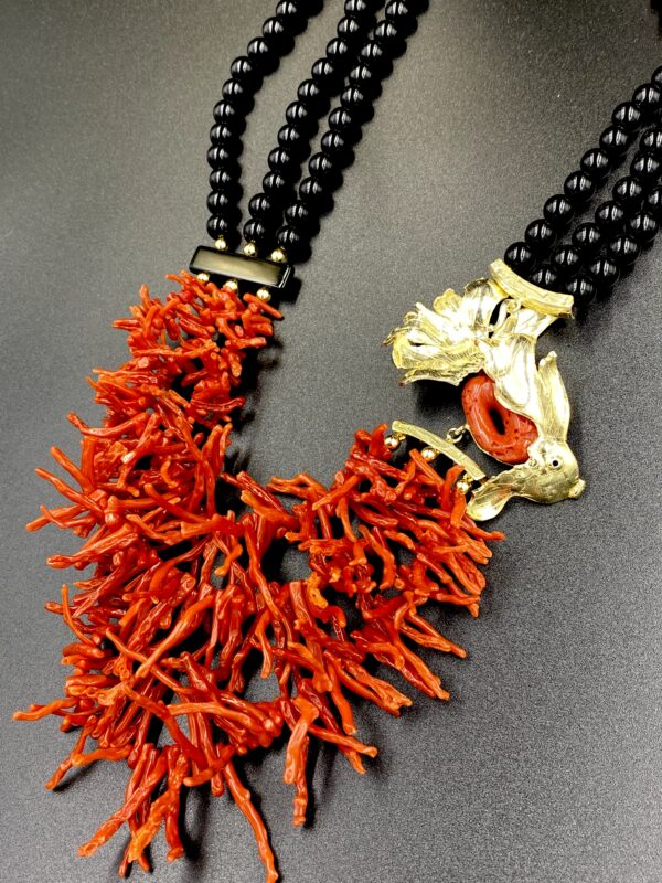 Collana Corallo Rosso Rubrum chiusura pesce in Argento 925% Rodiata con finitura oro giallo, completamente artigianale