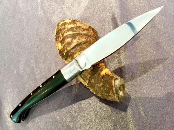 Coltello pattadese artigianale Gavino c Lama 10 cm Acciaio c70 Misura totale cm 22. Manico incorno di bufalo striato.