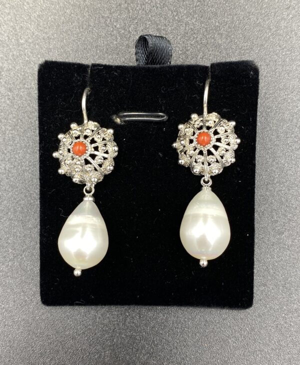 Orecchini Filigrana Argento 925% Corallo Rosso Rubrum Riccio
